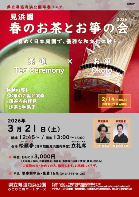 見浜園内茶室「松籟亭」(しょうらいてい)立礼席(りゅうれいせき)で開催される春のお茶とお箏(おこと)の会2026 -和文化体験-は、お箏の演奏と薄茶点前拝見、抹茶と和菓子を楽しむ体験型イベントです。