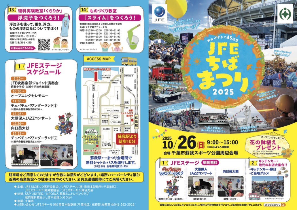 千葉市の秋を彩る恒例イベント「JFEちばまつり2025」が、千葉市蘇我スポーツ公園周辺会場で開催されます。地域との共生をテーマに始まった歴史あるお祭りで、ステージイベントや展示、グルメ出店など多彩な催しが楽しめます。子どもから大人まで夢中になれる「理科実験教室」や「ものづくり教室」、船や工場の見学会など、家族みんなで参加できる体験が盛りだくさん。音楽ライブや太鼓演奏、みこし大会なども行われ、にぎやかな一日を満喫できます。