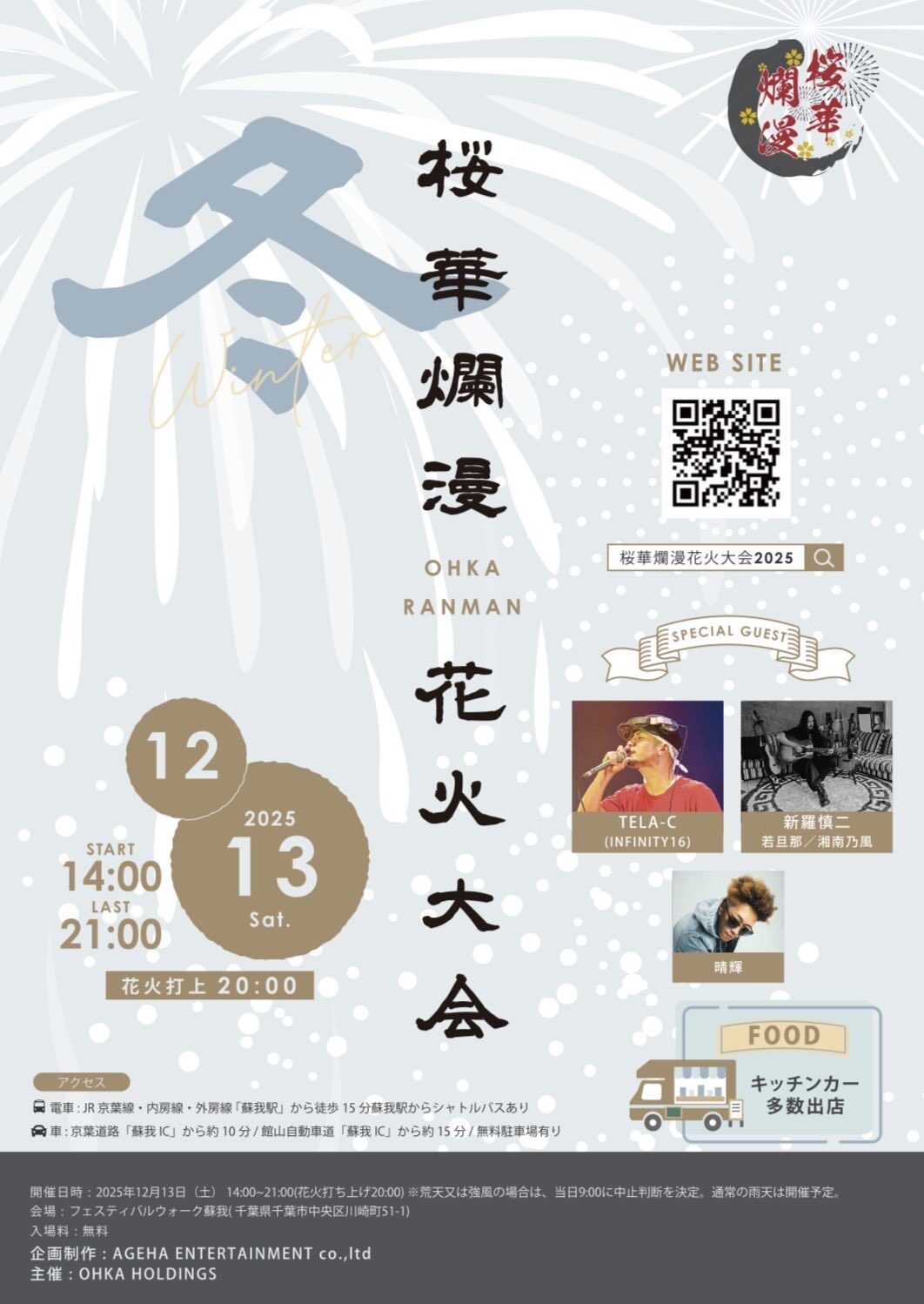 冬の澄んだ夜空を舞台に、音楽と花火が美しく交差する特別なイベント「桜華爛漫 2025 冬」。フェスティバルウォーク蘇我を会場に、ライブステージや太鼓演奏、キッチンカーの賑わいとともに、クライマックスには華やかな花火が夜空を彩ります。地域への感謝と想いが込められた演出が随所に散りばめられ、訪れる人それぞれの心に残る冬の一夜を演出します。音楽ファンも花火ファンも楽しめる、年末ならではの温度を感じるイベントです。